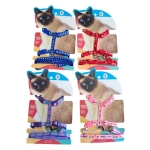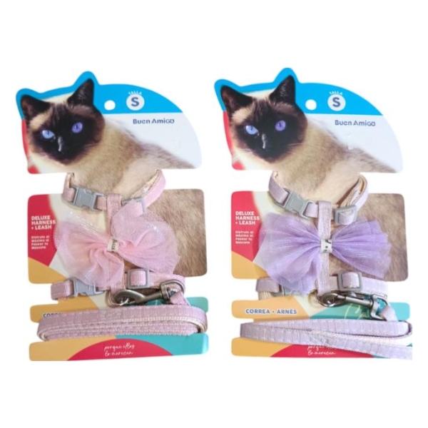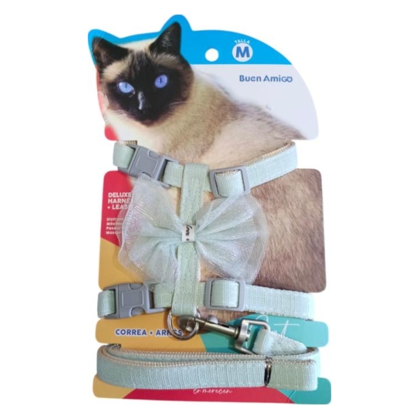 Este es un arnés tipo H para gatos CON MOÑO. Fabricado con correas de nylon duradero. Su diseño distribuye la presión de manera uniforme a lo largo del pecho y los hombros, evitando tensiones en el cuello, lo que permite paseos seguros y cómodos.