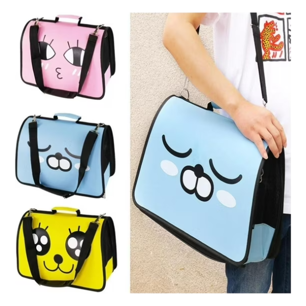 Bolso transportador para mascotas con diseño de carita tipo dibujo animado, ideal para transportar gatos y perros pequeños o medianos de forma cómoda y segura. Cuenta con asas de mano y correa ajustable para el hombro, estructura semirrígida y paneles laterales que aportan ventilación y buena visibilidad al interior.