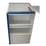 Unidad móvil de emergencia utilizada en contextos clínicos para intervenciones críticas como paros cardiorrespiratorios. El modelo exhibido presenta estructura metálica en tonos azul y blanco, con múltiples cajones de acceso rápido, codificados por color para facilitar la identificación de insumos. Incluye superficie superior para procedimientos, soporte lateral para accesorios y poste para soluciones intravenosas. Su diseño optimiza la respuesta inmediata en situaciones de urgencia.