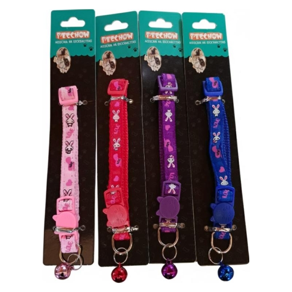 Estos son collares ajustables para gatos Anti Ahorque, disponibles en varios colores vibrantes como rosa, rojo, morado y azul. Están fabricados con una correa de tela con un estampado de pequeños conejitos, e incluyen una campana.
