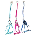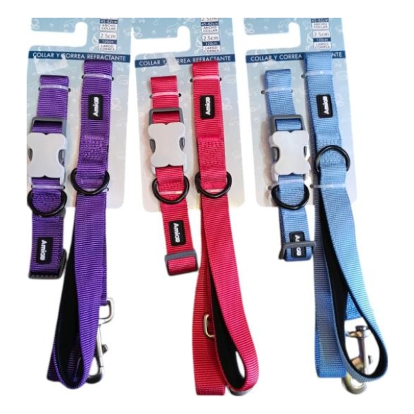 Set de collar y correa reflectante para mascotas, fabricado en nylon ajustable y ligero, diseñado para perros pequeños o medianos. Incorpora hebilla plástica de cierre rápido, argolla metálica para enganchar la correa y bandas reflectantes que mejoran la visibilidad y seguridad en paseos con poca luz.