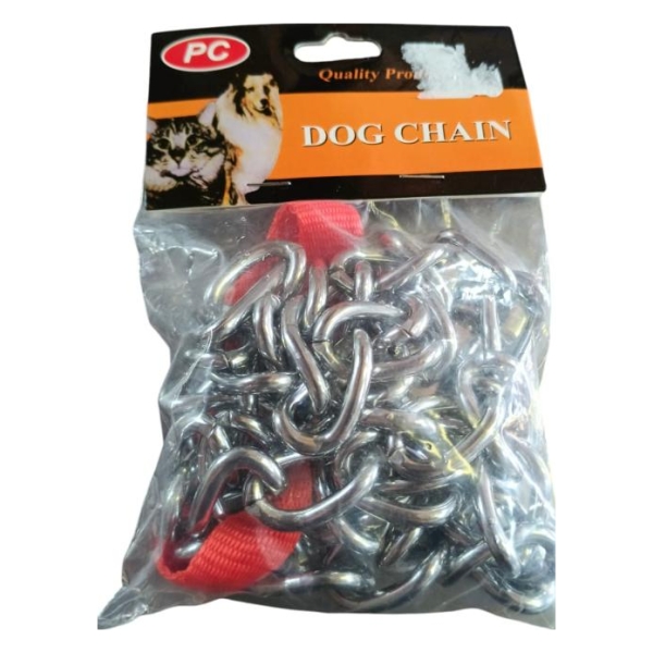 Correa para perro tipo cadena fabricada en eslabones metálicos resistentes, ideal para perros medianos o grandes que requieren un agarre firme y difícil de morder o romper. Incluye asa o cinta textil para sujetar con comodidad y un mosquetón metálico en un extremo para fijarla de forma segura al collar o arnés durante paseos o permanencias controladas.