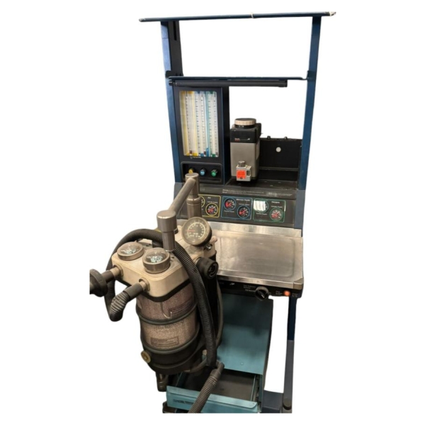 Equipo electromédico diseñado para administrar mezclas controladas de gases anestésicos durante procedimientos quirúrgicos. Cuenta con medidores de flujo verticales (rotámetros), manómetros analógicos para aire, óxido nitroso y oxígeno, y un vaporizador central para agentes volátiles. Su panel de control incluye interruptores, indicadores luminosos y reguladores precisos. El sistema incorpora una unidad de succión frontal y está montado sobre estructura metálica con superficie de trabajo y almacenamiento inferior.