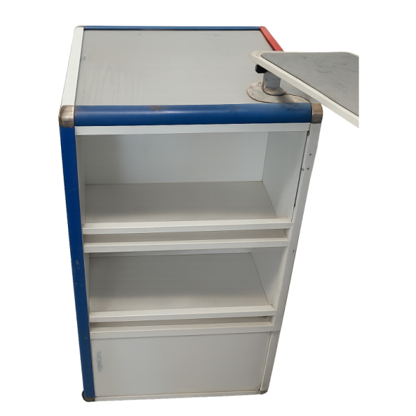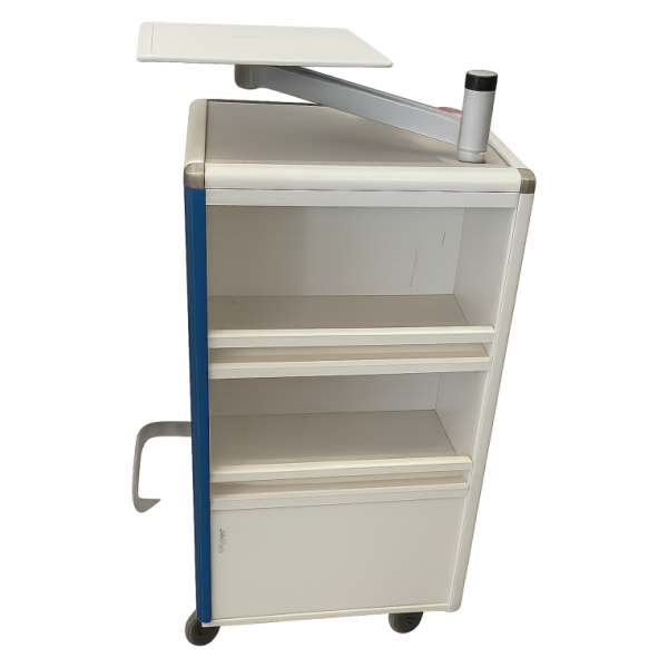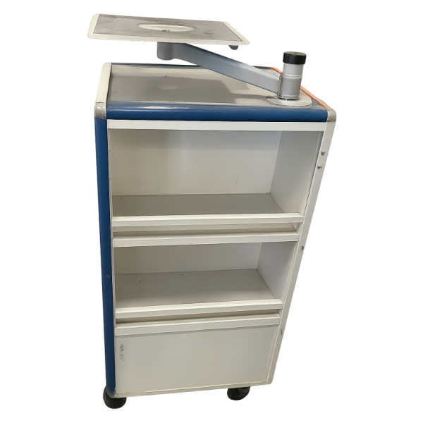 Estructura metálica de tres niveles, diseñada para alojar equipos de laparoscopía en entornos clínicos o quirúrgicos. Presenta marco tubular azul con paneles blancos, bandejas abiertas para fácil acceso y una bandeja lateral giratoria para soporte auxiliar. El equipo muestra signos de uso funcional—como desgaste superficial y marcas operativas—pero mantiene su integridad estructural. Ideal para almacenamiento y operación de dispositivos médicos especializados.