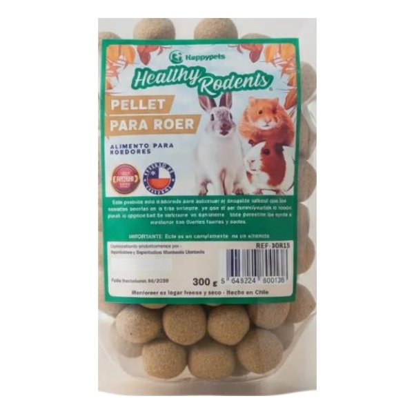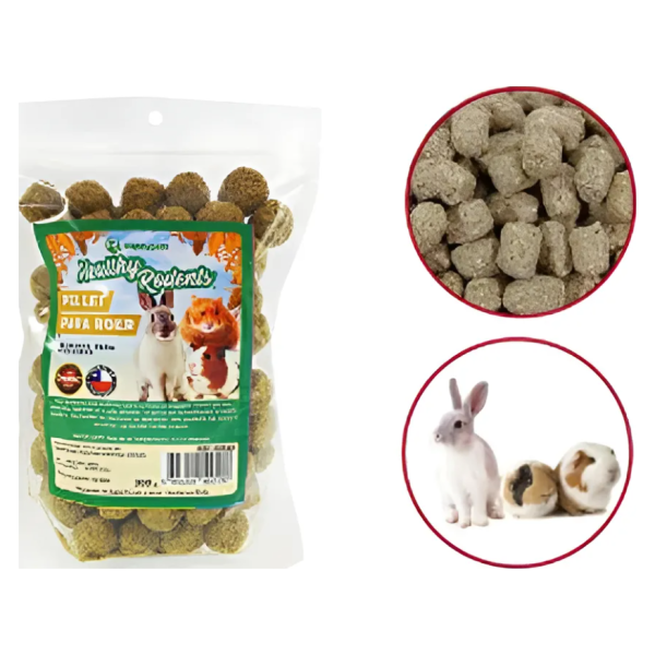 Alimento tipo pellet para roedores Healthy Rodents, formulado para conejos, cuyos y hámsters, que ayuda a satisfacer su necesidad natural de roer mientras aporta nutrientes esenciales. Presentado en formato de 300 g, se ofrece como complemento a la dieta diaria para favorecer el desgaste dental y apoyar una digestión saludable.