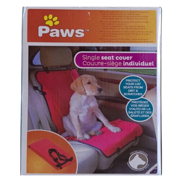 Cubreasiento individual para autos Paws, diseñado para proteger un solo asiento del vehículo contra pelos, suciedad y rayas producidas por las patas de la mascota. Se instala fácilmente mediante correas ajustables que se sujetan al respaldo y base del asiento, y se retira sin complicaciones para su limpieza o almacenamiento.