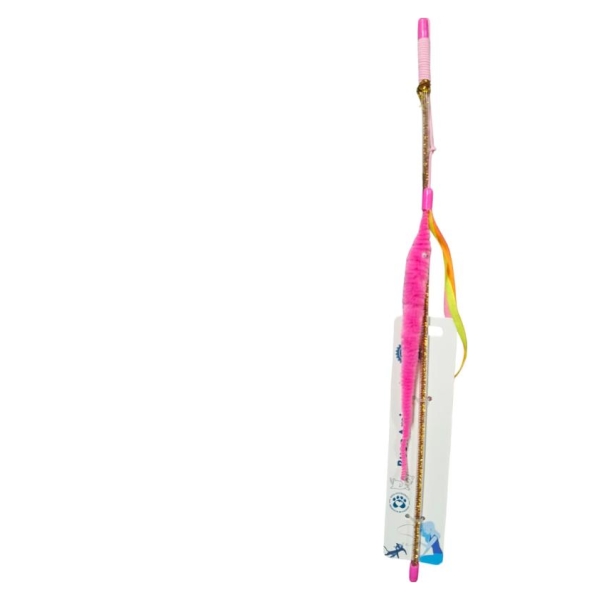 Esta varita para gato es un juguete dinámico diseñado para fomentar el juego activo y el ejercicio. Cuenta con una estructura alargada con extremos rosados, una sección central de felpa suave y cintas de colores que cuelgan para atraer la atención del gato. Al moverla, estimula el instinto de caza y proporciona momentos de diversión compartida entre el dueño y su mascota. Ideal para mantener a tu gato entretenido y en movimiento dentro del hogar.
